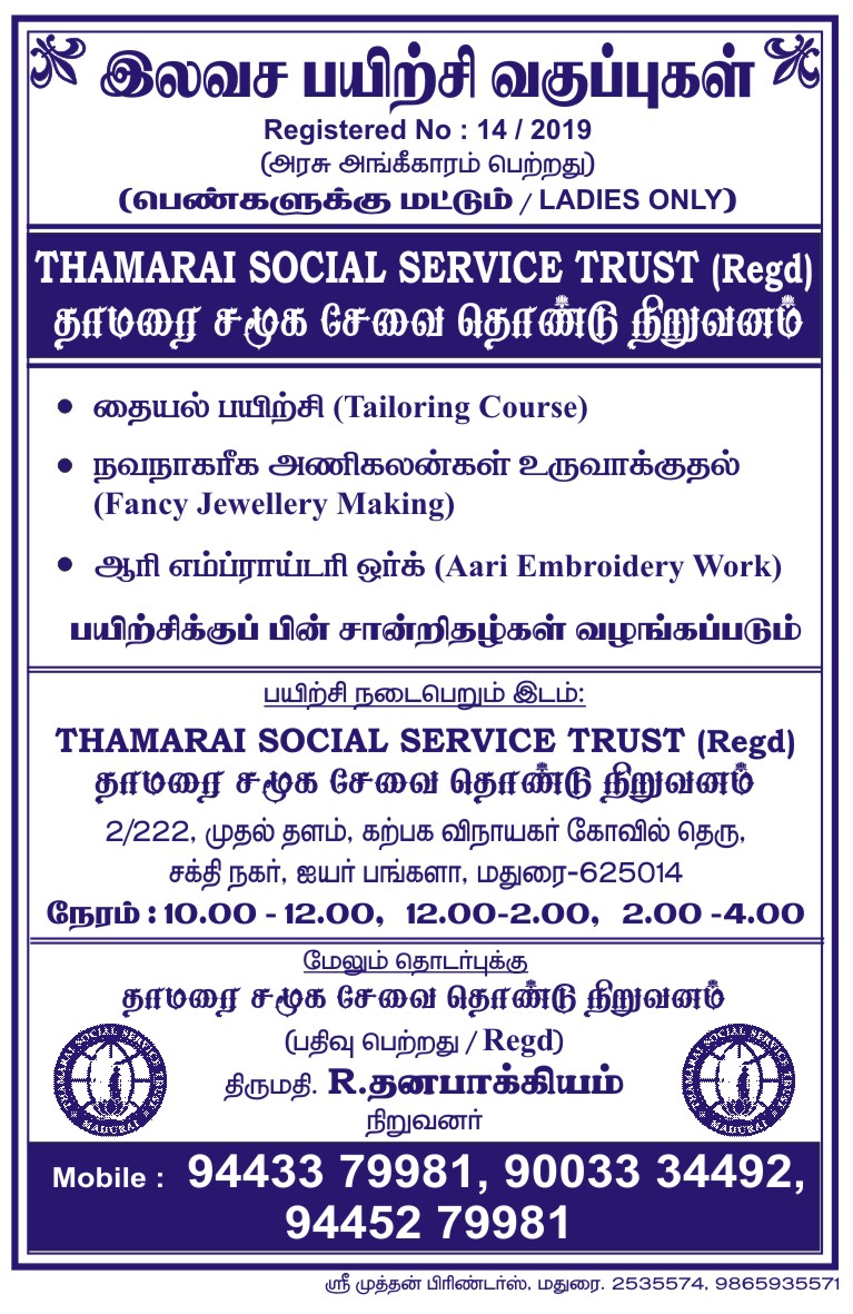 Thamarai Social Service Trust is a service oriented trust. The trust is established on 13th Day of March 2019 for servicing the down drone people. It is a registered organization under the Indian Trust Act. The trust should serve the people in all aspects and supporting them in poverty alleviation.